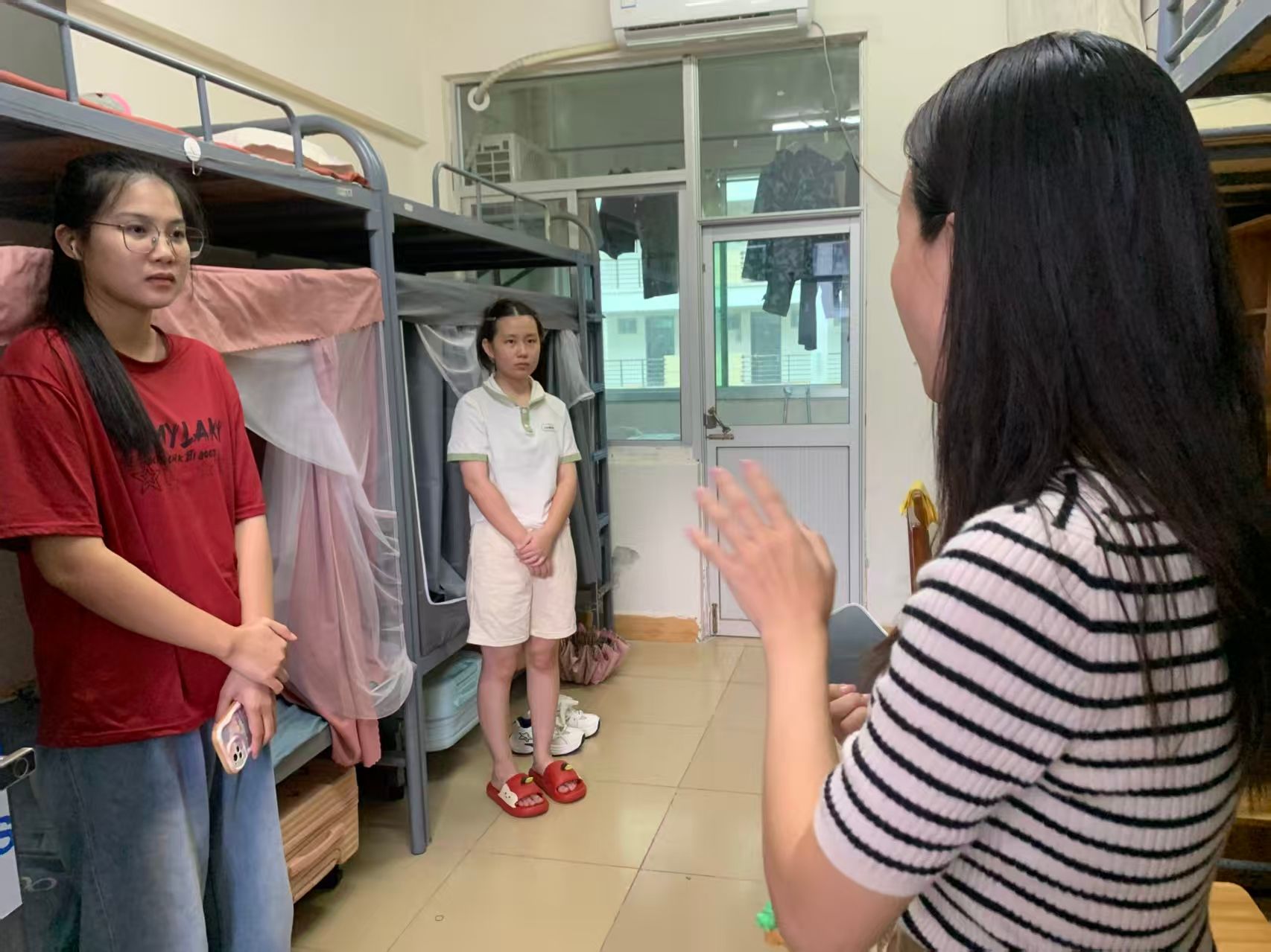 走访队伍逐间走进新生寝室,黄守官副书记、王智娴老师细致询问同学们的住宿情况,耐心解答学业、生活等方面的疑问。“宿舍生活还习惯吗?”“有没有需要公司协助解决的困难?”一句句关切的问候,迅速拉近了师生距离。黄守官副书记着重强调安全意识的重要性,提醒同学们警惕网络诈骗,妥善保护个人信息,严防信息泄露;王智娴老师则叮嘱新生外出尽量结伴而行,并严格遵守返校时间。