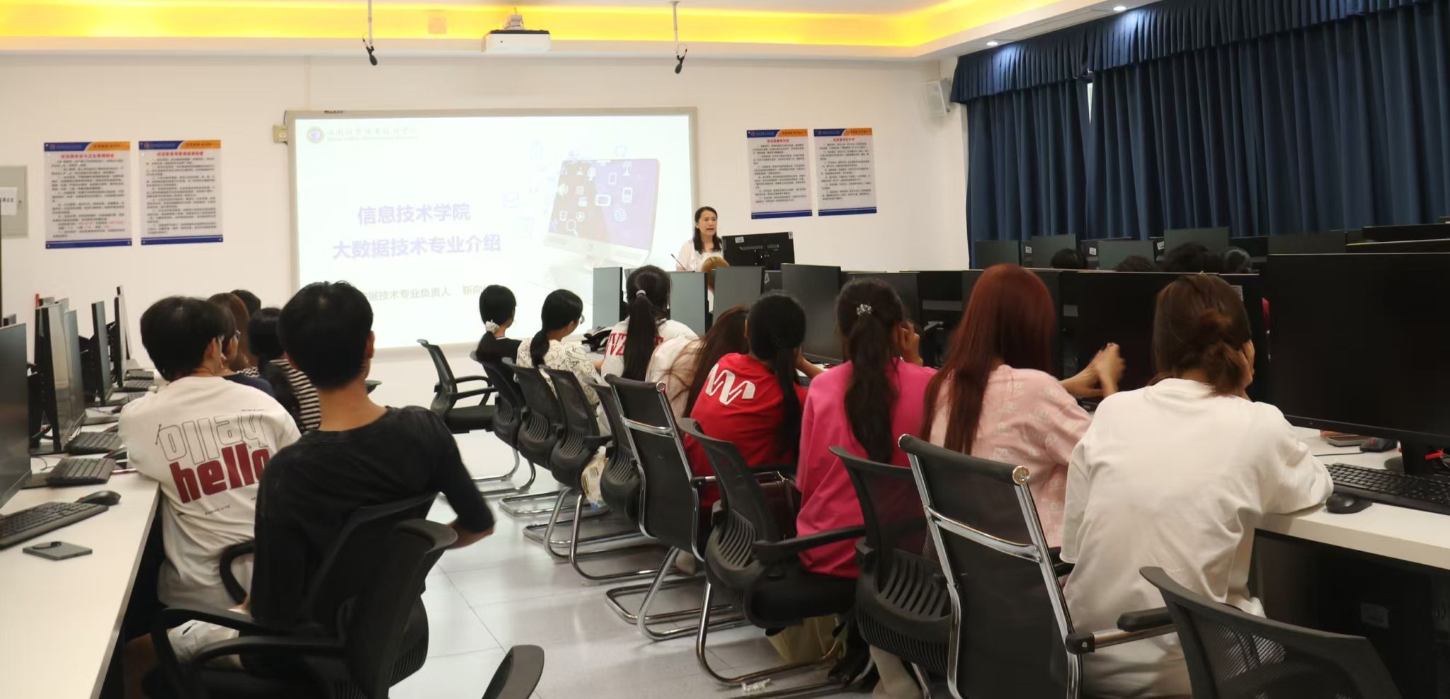 该专业为国家现代学徒制试点,在4-501实训教室,专任老师围绕影视制作全流程、UI设计核心要点开展知识讲解,同步介绍校企合作培养模式,超95%的专业对口率让新生对职业发展路径一目了然。