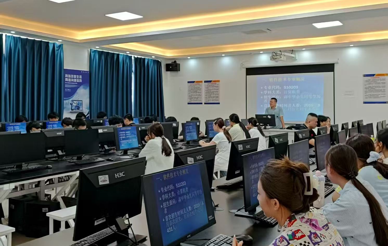 4-301实训教室内,专任老师聚焦与海科的“3+2”联办升学模式,演示Java开发、前端项目实战,拆解升学与就业双轨流程,以96.35%的毕业落实率为新生厘清职业方向。