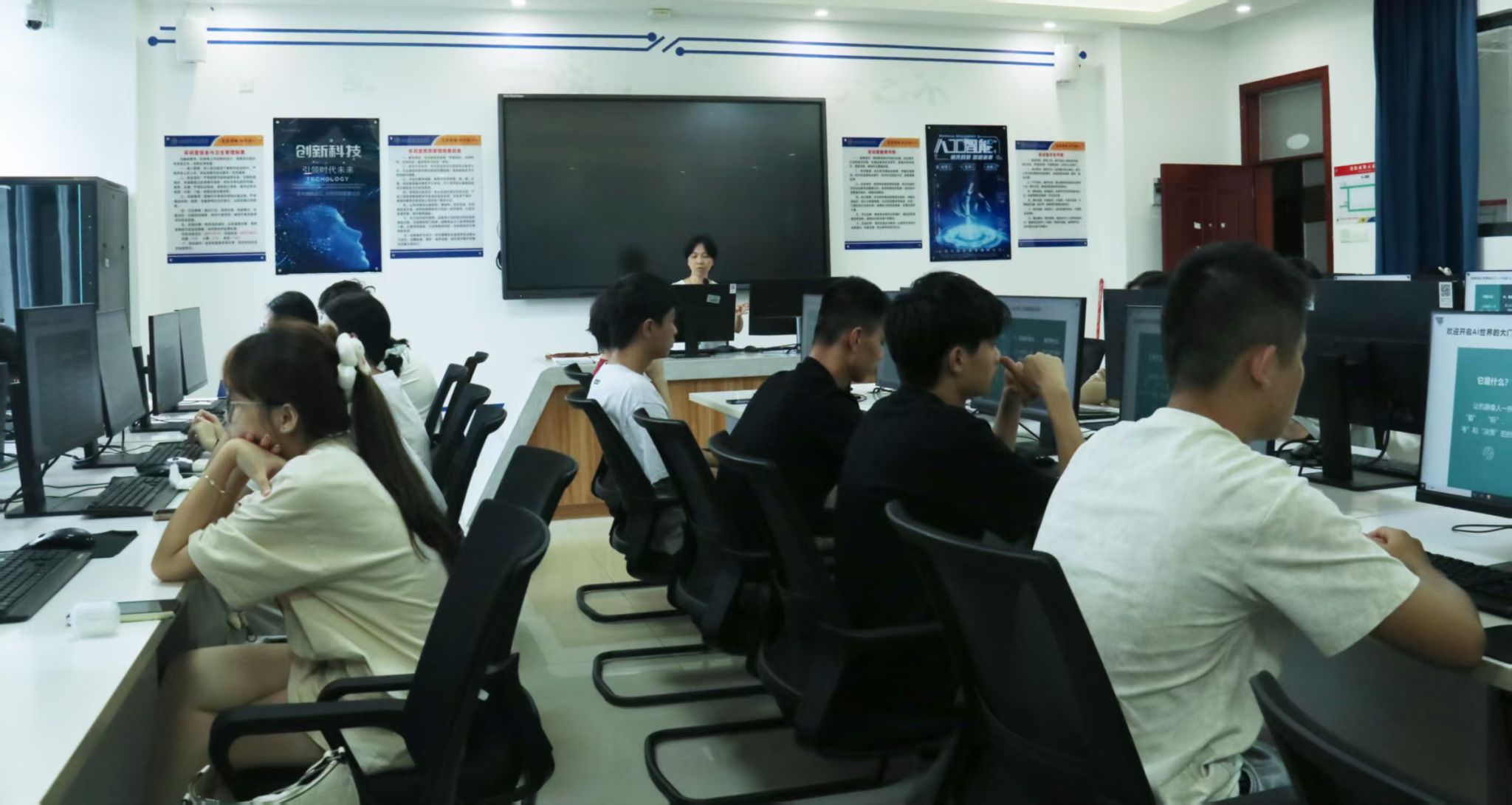 作为海南首个高职AI专业,专任老师在4-305实训教室,围绕AI模型训练原理、技术应用逻辑展开讲解,结合“AI+海南”产业案例剖析专业发展前景,同步明确就业岗位及薪资优势,助力新生构建专业认知体系。