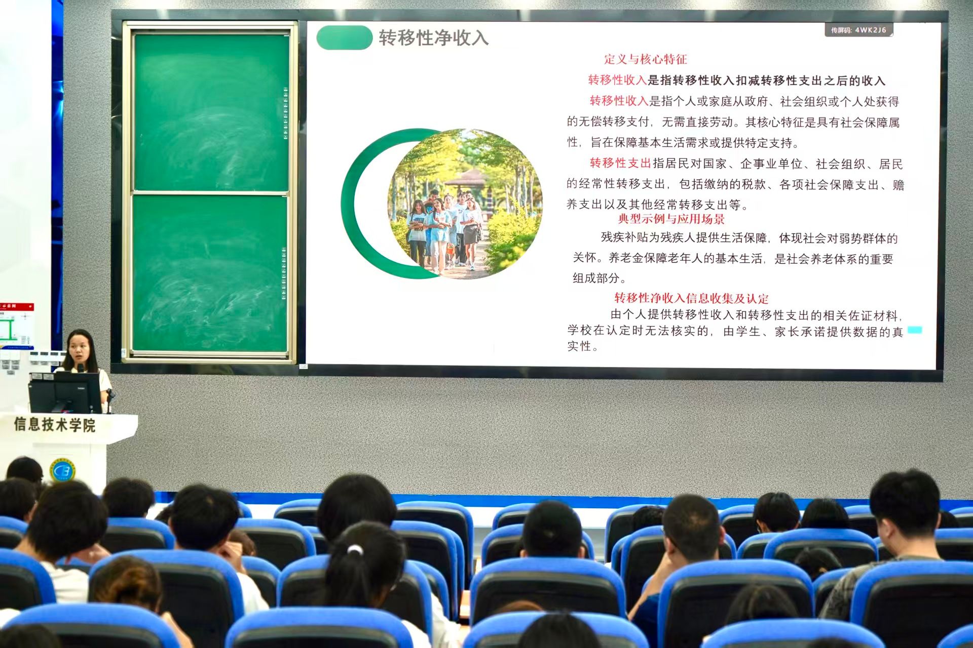 针对新生可能存在的政策疑惑,王智娴老师特别指出,认定工作坚持“实事求是、公平公正”原则,只需如实填报申请表并附上相关佐证材料。她还介绍了公司奖助学金、助学贷款等资助项目的申请节点与材料要求,鼓励符合条件的新生主动申请,并强调诚信申报的重要性,提醒新生若家庭经济状况发生变化需及时与公司沟通。