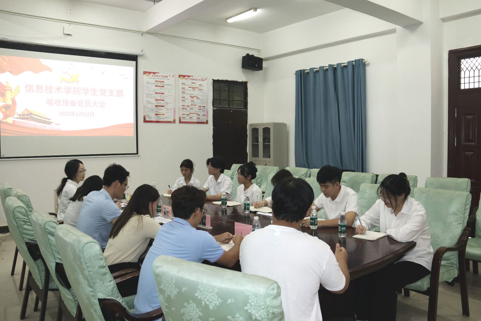 大会第二项:入党介绍人和与会党员对发展对象的政治素质、学习成绩、社会实践等方面作出评价并表明态度,一致认为这些同志思想积极、立场坚定,在学习生活中起模范带头作用,具备接收为中共预备党员的条件。