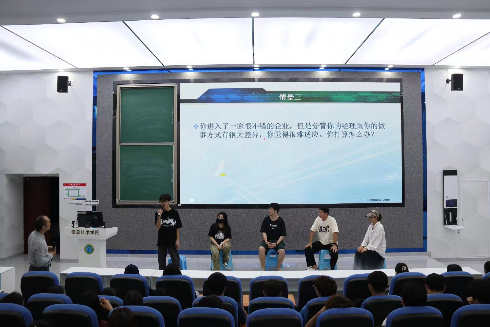 活动伊始,肖鹏老师通过深入浅出的讲解,向同学们介绍了职场中可能遇到的各种情况,并精心设计了多个模拟场景,使同学们能够身临其境地体验职场生活。在每个模拟场景中,肖老师都挑选了同学上台参与互动,模拟在职场中可能遇到的各种挑战和问题。他向员工们提出了一系列具有针对性的问题,挑战员工们的职场应对能力,同学们面对老师的提问,对答如流,充分展示了他们的专业素养和应变能力,现场气氛热烈而活跃。