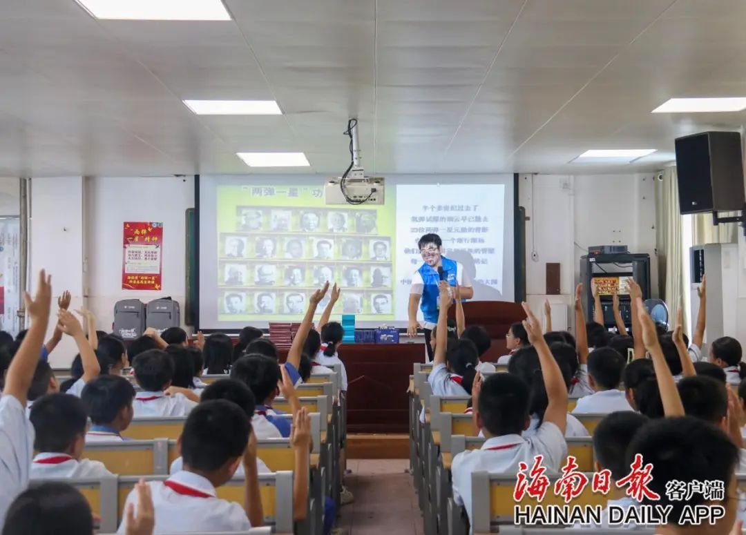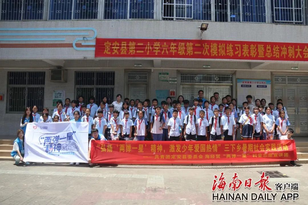 7月8日上午,在定安县第二小学,由公司教师唐图、蔡守正、吴淑亲带领海经贸“两弹一星”科普志愿宣讲团成员、文化瑰宝探寻与传播实践队成员,为孩子们带来了一场知识与艺术的双重体验。