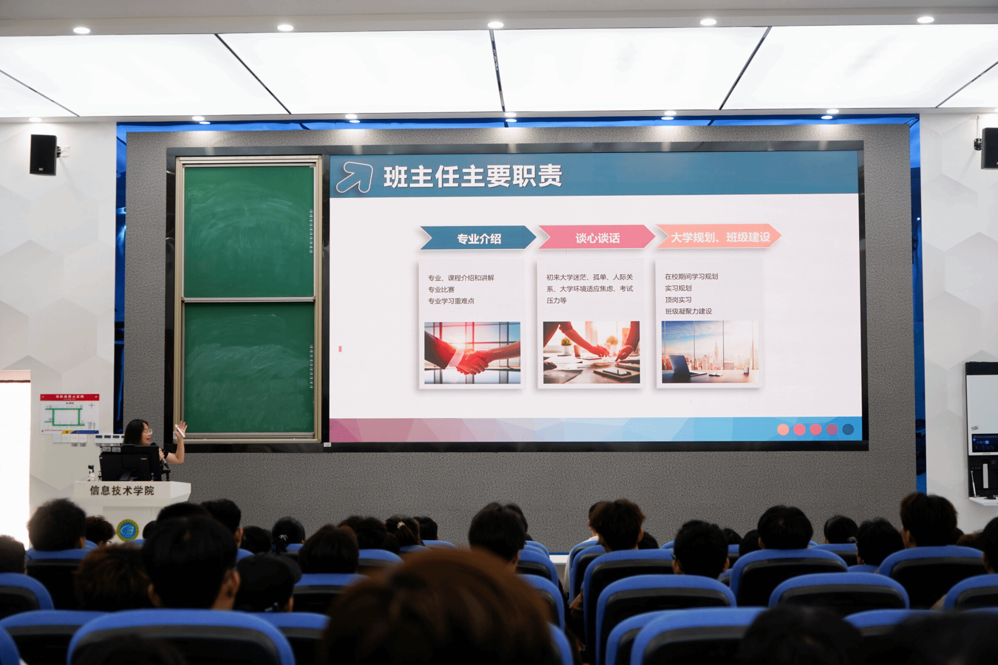 会议伊始,蔡老师为新生们详细阐述了代班、班主任的职责以及他们的联系方式,并介绍了辅导员的日常管理工作,包括信息统计、紧急事件处理等,为新生们提供了一个安全有序的学习环境。同时,蔡老师还讲解了请假流程和军训要求,帮助新生们更好地适应大学的校园生活。