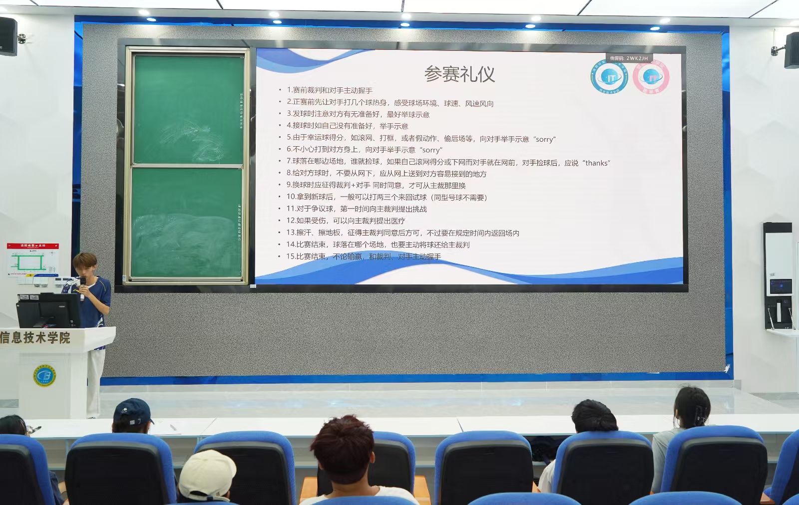 大会开始前,参赛选手及裁判阅读承诺书并签署承诺书。随后,大会在主持人充满感染力的发言下开场,并邀请吴佳华老师致辞。吴佳华老师难掩首次参与公司自主体育赛事的喜悦,首先对师生支持与工作人员前期筹备工作表达感谢,而后围绕赛事核心价值提出三点期望:“第一,享受比赛过程,坚守‘友谊第一,比赛第二’的原则;第二,双打搭档需如齿轮般精密配合;第三,面对任何困难球都要‘一追到底’。”这三点倡议既聚焦竞技精神,又强调团队协作,引发在场人员共鸣。紧接着,活动总负责人展开赛事细节讲解,同时提及赛程安排与安全注意事项,为赛事规范化运行筑牢基础。最后,开展裁判培训会,确保比赛公平公正,保障比赛顺利进行,树立良好赛事形象,以专业执裁为赛事营造积极氛围,提升赛事品质。