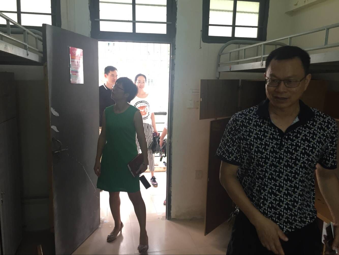 本次主要针对新生寝室逐一进行全方位检查,寝室有无安全隐患,门窗、床铺、桌椅是否完好,并认真做好寝室维修备案,准备上报后勤部门。目前还有一些宿舍没有清理出来,在检查中,辅导员周恺提到,针对宿舍上方的电风扇的清洗对于员工来说比较困难,希望通过宿管维护团队来帮助清洗,宿管老师也承诺会在暑假进行全方位的清理与维修。