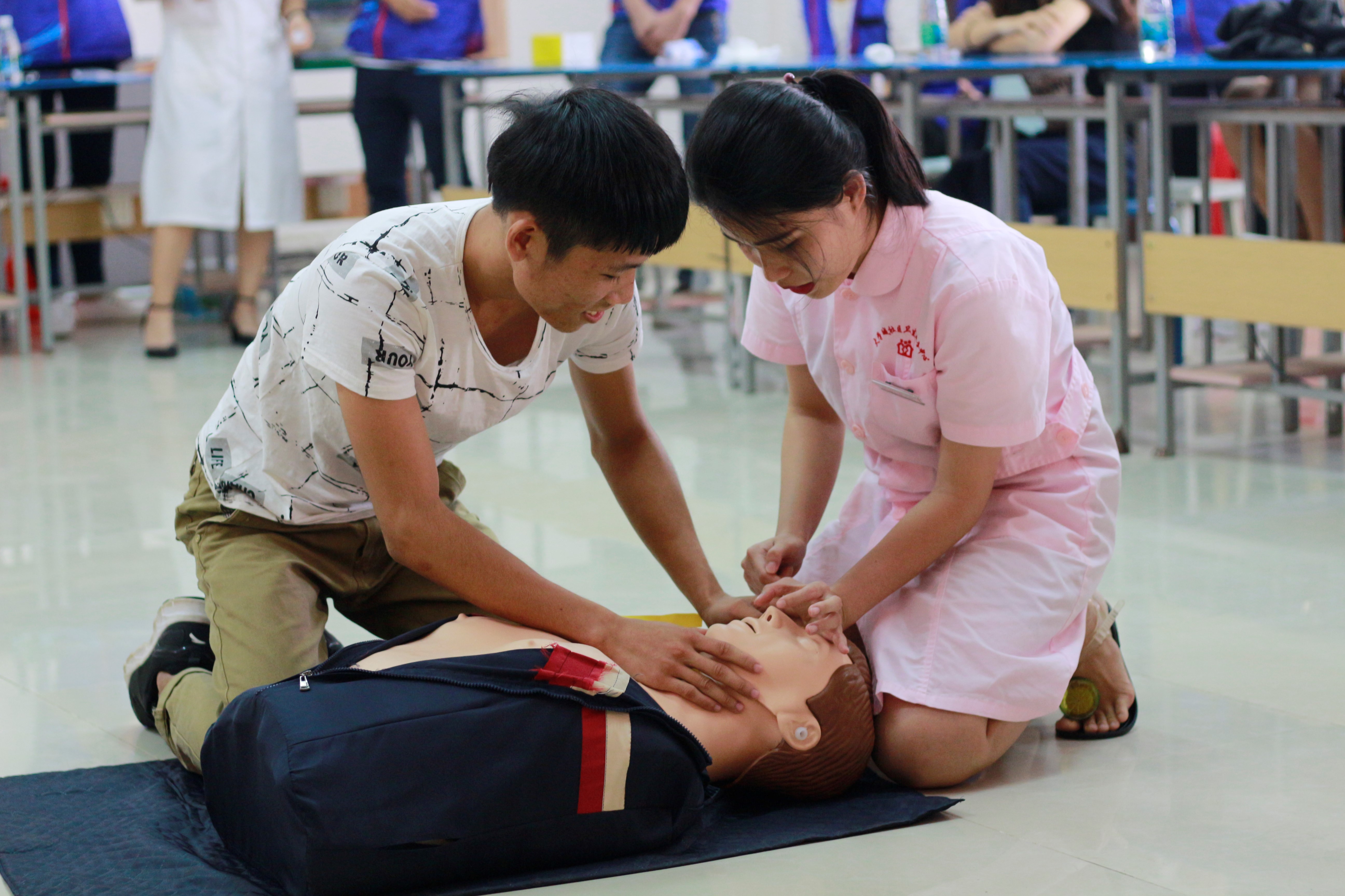 现场实操练习,现场还准备了一个仿真人模,大家在医生的指导下依次在仿真人体上演练了人工呼吸、胸外按压等技术。在场的工程技术公司青年志愿者协会的成员和同学们积极参与,医生、护士也现场纠正了同学们的一些错误做法。急救培训考验的是救护者的耐心与动手能力。在整个急救知识的传授和练习的过程中,整个现场充满了欢声笑语。在轻松的环境下,同学们学到了应对突发性意外疾病的基本方法。大家都想利用这次宝贵的机会提高自己的实践操作能力,现场的学习气氛积极而又热烈。