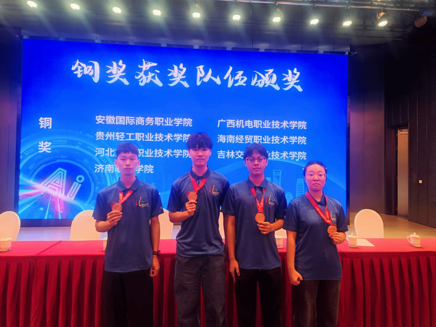 本次大赛吸引了全国众多优秀职业院校参与,竞争异常激烈。人工智能赛道重点关注参赛者在机器学习、计算机视觉、自然语言处理等前沿技术的综合应用能力。由刘佳、方顺、林齐辉、余灿四位同学组成的团队,在王忠和符龙生两位指导老师的带领下,凭借出色的技术能力和稳定的现场发挥,最终斩获铜奖。