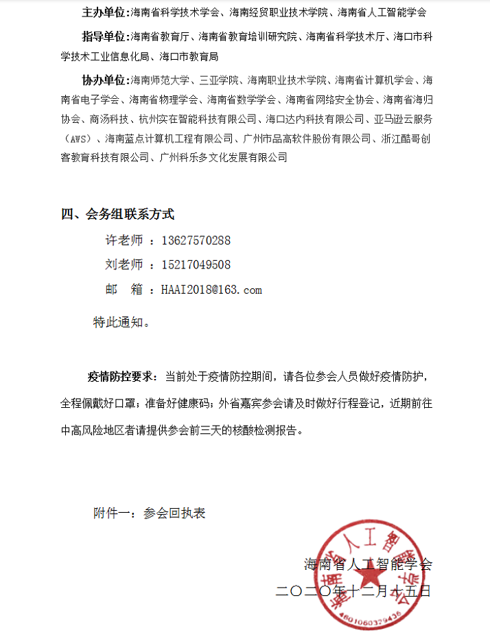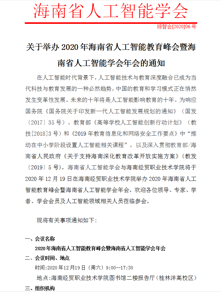 关于举办2020年海南省人工智能教育峰会暨海南省人工智能学会年会的通知